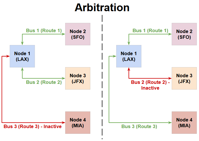 Arbitration has another issue. Say you have decided to fly one of your planes from LAX to SFO and back on a Friday, but from LAX to MIA on Saturday. (And the other plane is going to JFK both days.) However, thunderstorms hit SFO on Friday, grounding all flights. This means the flight won’t be back to LAX in time for the trip to MIA. So this flight becomes a single point of failure for two of your routes. While the weather does not affect electrons in your chip, failures of other types are possible - say you are using a round-robin arbiter, but one of your core runs into an infinite loop - that core does not release the bus and stops the entire chip from executing. That’s the risk with arbitration-based approaches.