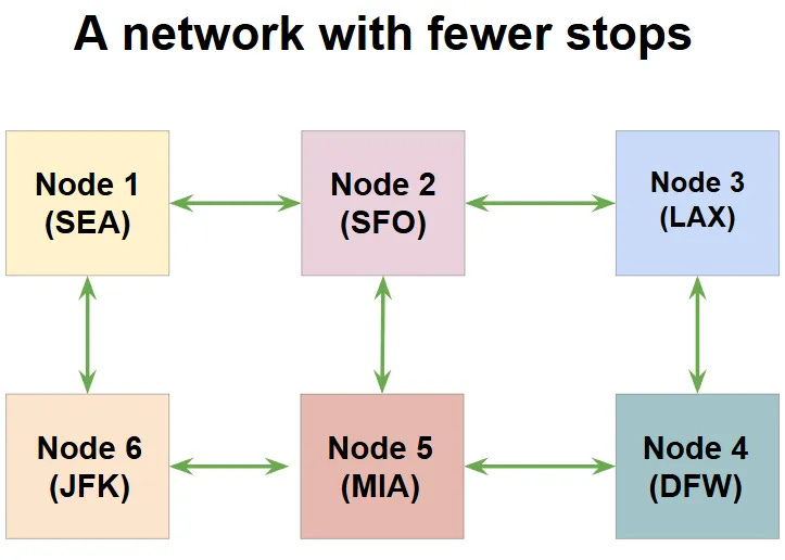 Unlike the crossbar architecture, which adds a strain (more staff, larger number of boarding gates, and so on.) on your “hub” for each new destination, this ring-style approach does not stress any single node. (Remember, in chip terms, this “stress” means wire latency.) However, you might already see a problem here - we have introduced connections with 2 stops which would never exist in a crossbar model. (For example, SFO-MIA.) If such 2-stop routes are undesirable, then a simple connection above can fix that - add a direct route between SFO and MIA.