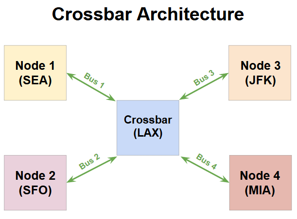 Crossbars effectively address both the shortcomings that we saw with arbitration. First, they are able to ensure that all nodes can communicate with each other simultaneously. (The crossbar is assumed to have an ability to monitor these transactions and handle them correctly.) In our airplane example with a hub, we are theoretically able to transport 600 unique passengers in a day. (300 in the morning from SEA/SFO to LAX, and 300 later to JFK/MIA.) Also, the presence of a crossbar means that each failure is restricted to it’s own node - if one of the cores in the chip hit’s an infinite loop, the other cores can still talk to the other nodes through the crossbar.
