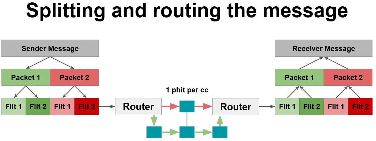 It might seem like ages ago, but if you remember from the start of this post, the purpose of on-chip networks is to move data from one point in a chip to another. Due to the complexity of NoC architectures, we have a dedicated unit in each node to manage the sending and receiving of this data - called a Router. So far in this post, we assumed that all the data that we need to send out is sent together. (As a single transaction.) But in reality, it’s not practical to do this - for instance, if you want to move 1 GB worth of data as a single transaction, you would need 8,589,934,592 wires (i.e. one for each bit.) in each link. Instead, it is broken down into multiple pieces. Here’s what they are called: